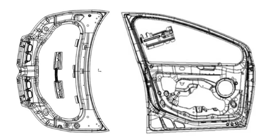 通过类似方法收集R33侧围外板废料,其卷料规格为0.85mm×1450mm,材料牌号为DX56D+Z。R33左右后轮罩前部零件,尺寸为0.8mm×930mm×254mm,材料牌号为DX56D+Z。