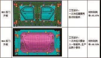 图4为MX3车型的左右后门外板零件模具设计与M44车型左右后门外板模具设计对比。MX3车型的左右后门外板一张板料冲压一个零件,零件的四个方向都需要工艺补充面;而M44车型左右后门外板为一张板料冲压出两个零件,相当于减少一个工艺补充面。通过对比,M44车型后门外板材料利用率比MX3后门外板材料利用率提高4.16%。