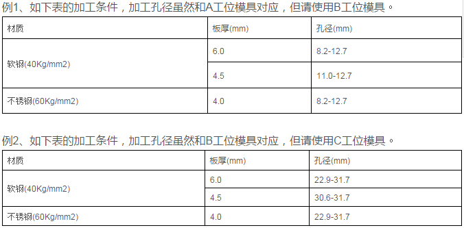 (2)厚板冲孔时,相对于加工孔径,请使用大一号的模具。注意:此时,若使用通常大小的模具,会造成冲头螺纹的破损。